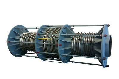 直管壓力平衡式波紋膨脹節性能特點:采用兩種不同規格的波紋管組成(通常一種規格的平均直徑是另一種的1.4倍),主要用于吸收軸向位移并能平衡波紋管的壓力推力,其壓力推力由波紋管自身結構件承受,管線固定支架僅考慮波紋管的彈性力及管道摩擦阻力。
